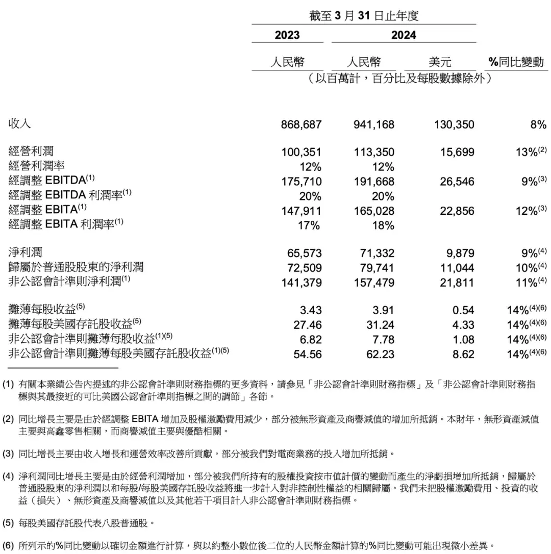 阿里巴巴收入 9411.68 億,同比增長 8%;凈利潤 713.32 億元,同比增長 9%。