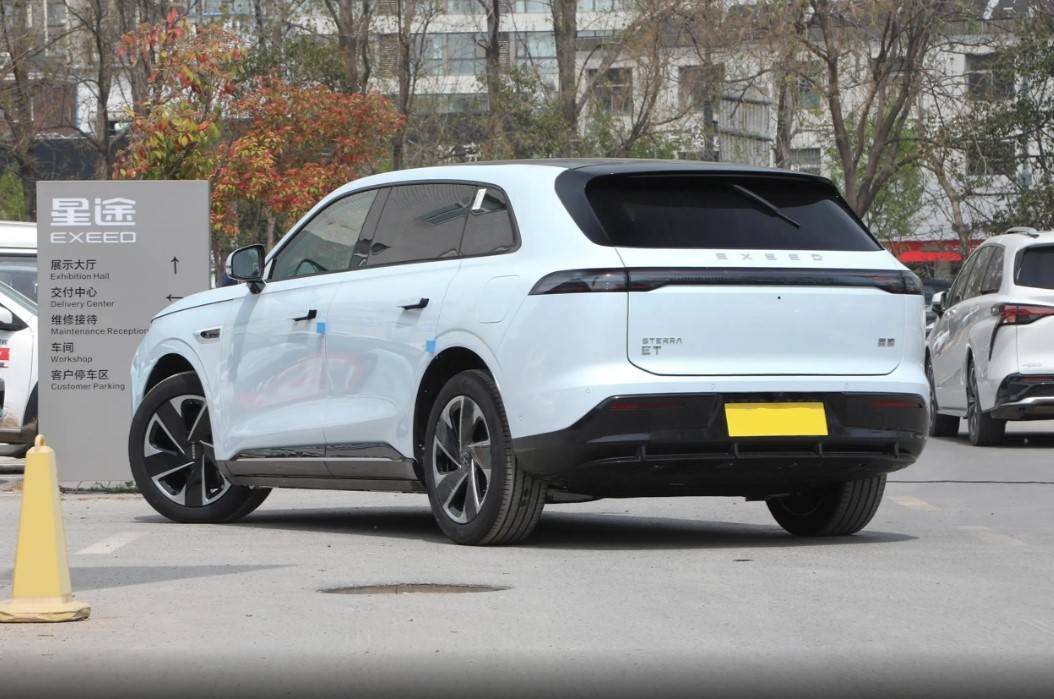 星紀元ET的車尾保持了較為敦實的結構,尾窗區域增加了凸出的環繞式邊角飾板,熏黑的涂裝也讓其與尾窗相互融合,尾燈采用貫穿式結構,并在兩側燈組上進行了增粗處理,EXEED的銘牌則鑲嵌于尾窗與燈帶間隔區域,外凸的后包圍在尾門中部留下了清晰的折痕筋線,底部采用黑色組件覆蓋,并帶有擴散器的飾板裝飾,增程版同樣采用隱藏式排氣布局,保持了視覺上的簡化。