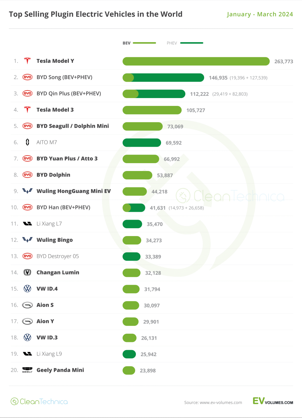 從上榜的車型可以看出,比亞迪無疑是大贏家。比亞迪宋PLUS新能源、秦PLUS新能源、比亞迪海豹、元PLUS、比亞迪海豚以及比亞迪漢這6款車型都躋身全球暢銷前10榜單。剩下的兩款國產(chǎn)品牌車型為問界M7和五菱宏光MINI EV。而一季度最暢銷的車型則被特斯拉Model Y拿下,另一款特斯拉Model 3排在第四。