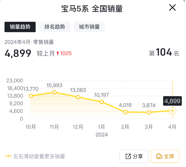 最新行業綜合銷量數據,2024年4月份,寶馬5系的單月零售銷量為4899臺。相比上個月,其銷量雖然有所回升,但是整體銷量規模,與往昔依然有很大的銷量差距。