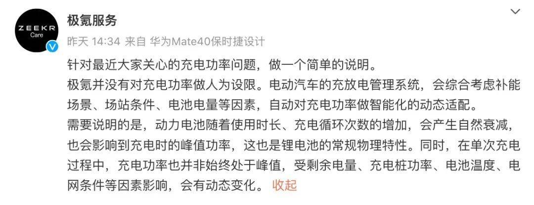 對于充電時的峰值功率,極氪方面解釋稱,動力電池隨著使用時長、充電循環次數的增加,會產生自然衰減,也會影響到充電時的峰值功率,這也是鋰電池的常規物理特性。同時,在單次充電過程中,充電功率也并非始終處于峰值,受剩余電量、充電樁功率、電池溫度、電網條件等因素影響,會有動態變化。