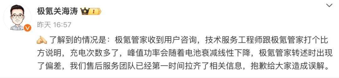 對于上述截圖中的提到充電次數問題,極氪在上述說明中并未進行解釋。對此,極氪CMO關海濤表示,是極氪管家在轉述技術服務工程師回答時出現了偏差,讓外界產生誤解。“極氪管家收到用戶咨詢,技術服務工程師跟極氪管家打個比方說明,充電次數多了,峰值功率會隨著電池衰減線性下降,極氪管家轉述時出現了偏差,我們售后服務團隊已經第一時間拉起了相關信息。”關海濤說道。