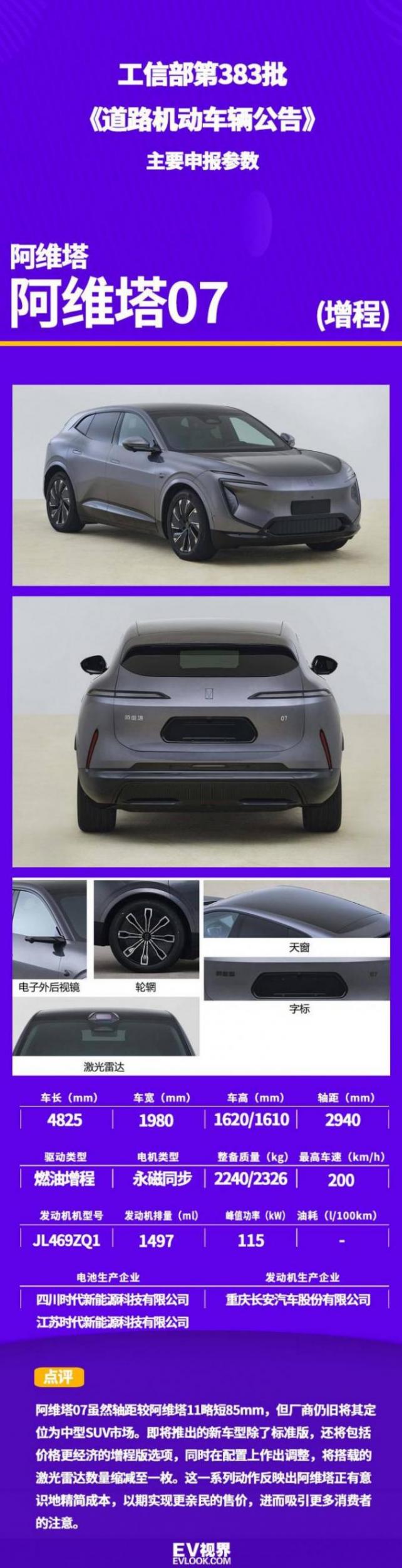 工信部公示第383批《道路機動車輛生產企業及產品公告》,其中阿維塔07在列其中。據悉,新車主打大五座布局的中型SUV,并且提供純電和增程兩種動力形式。
