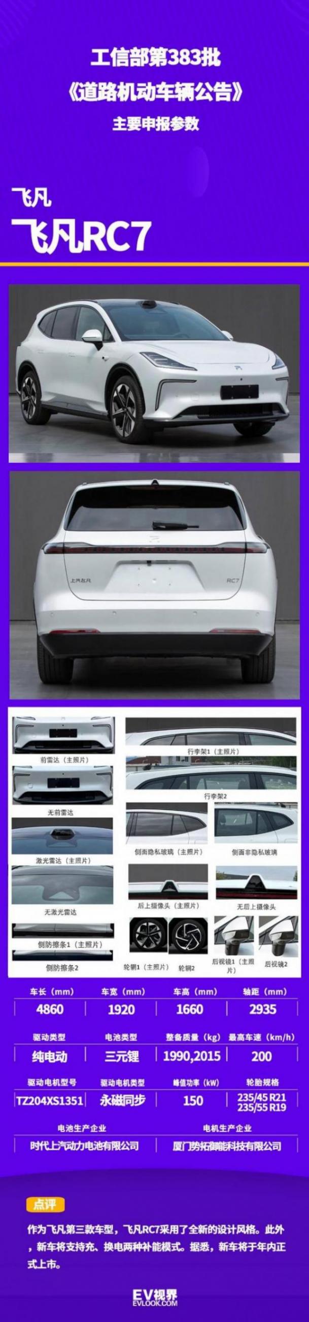 工信部公示第383批《道路機動車輛生產企業及產品公告》,其中飛凡RC7在列。作為飛凡第三款車型,新車采用了全新的設計風格。此外,新車將支持充、換電兩種補能模式。據悉,新車將于年內正式上市。
