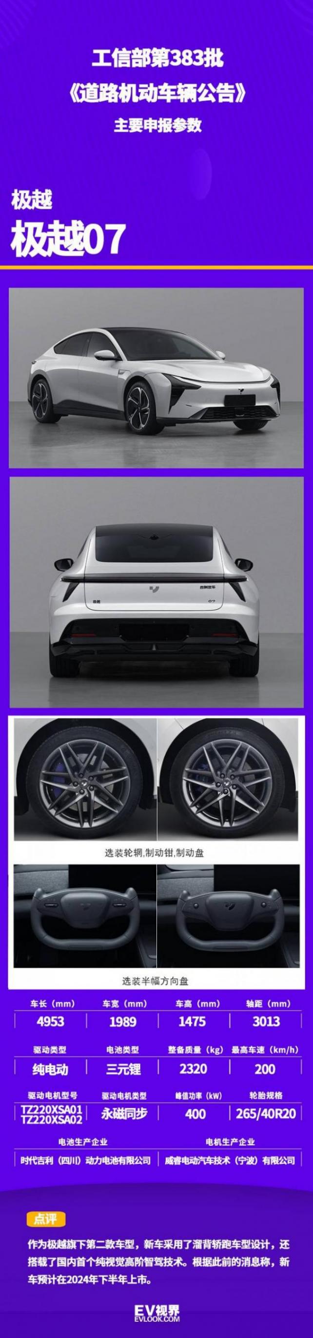 工信部公示第383批《道路機動車輛生產企業及產品公告》,其中極越07在列。作為極越旗下第二款車型,新車采用了溜背轎跑車型設計,還搭載了國內首個純視覺高階智駕技術。根據此前的消息稱,新車預計在2024年下半年上市。