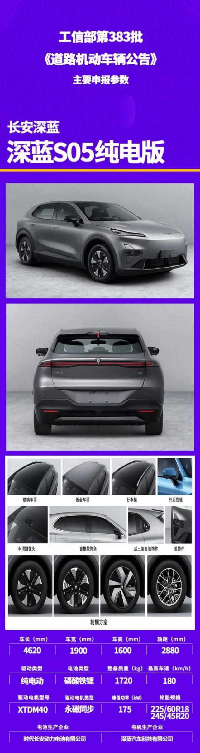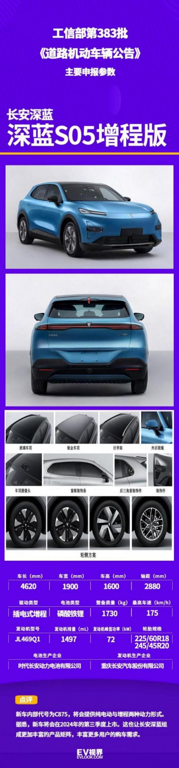 工信部公示第383批《道路機動車輛生產企業及產品公告》,其中長安深藍S05在列。新車內部代號為C875,將會提供純電動與增程兩種動力形式。據悉,新車將會在2024年的第三季度上市。
