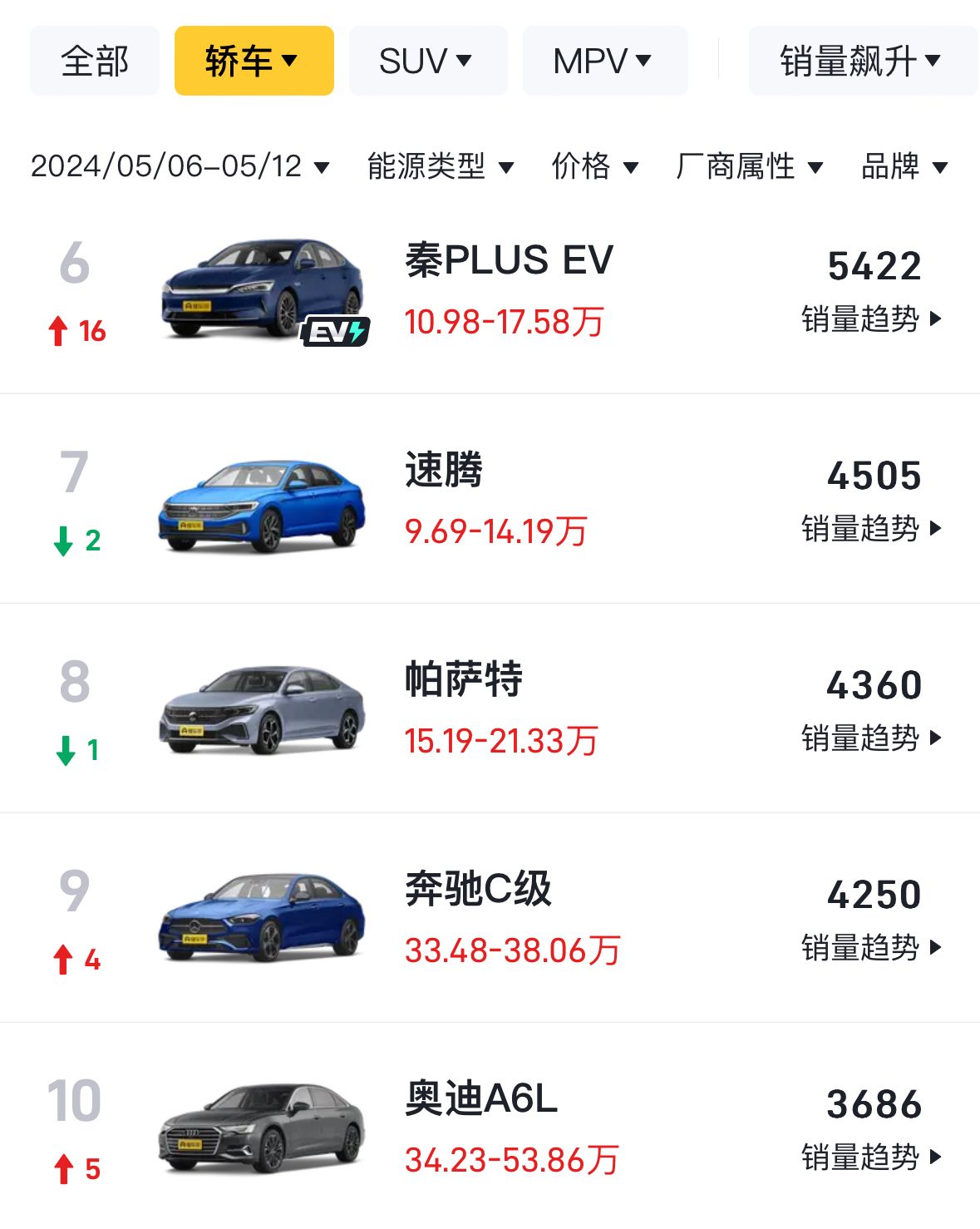 前十強內,除了比亞迪的四款熱門產(chǎn)品,其余車型也都是市場比較常見的熱門車型。其中軒逸、朗逸、速騰三款合資A級車仍然位居榜單中,而帕薩特則仍然是合資B級車市場的銷量冠軍,在豪華車市場上,奔馳C級和奧迪A6L在終端的大幅優(yōu)惠下,排名也在最新一周成功躋身前十。
