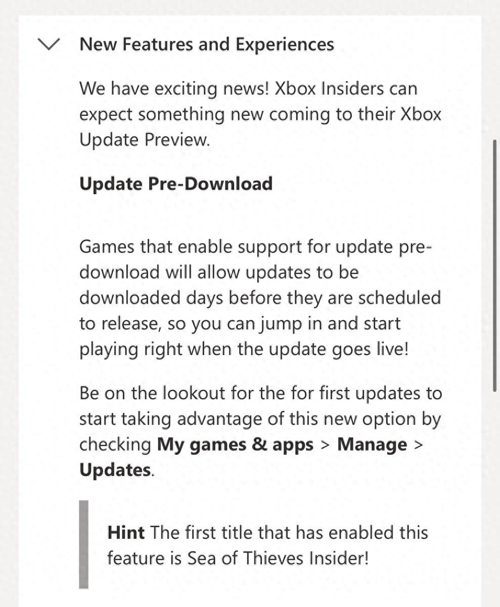 更新日志還提到,首款支持更新預下載功能的 Xbox 游戲是 Rare 的 Insider 版《盜賊之海》。