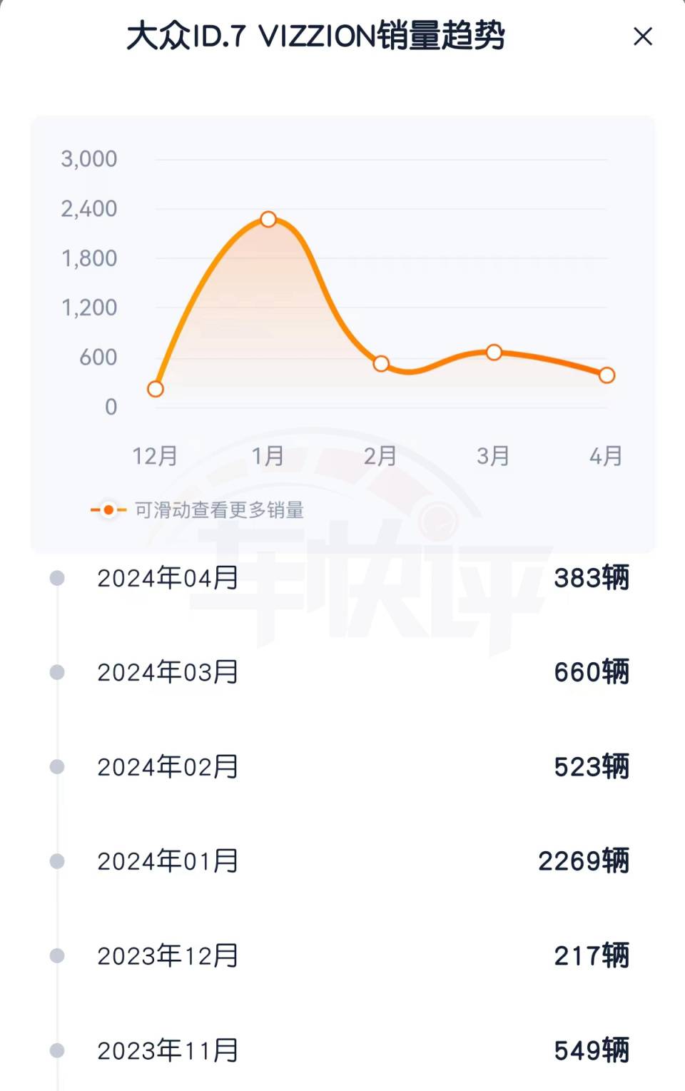 被一汽大眾給予厚望的中型純電轎車ID.7 VIZZION,4月銷量只有383輛。從去年11月至今,ID.7 VIZZION半年的銷量數(shù)據(jù)中,除了今年1月突破千輛之外,其他月份銷量都在千輛以下;