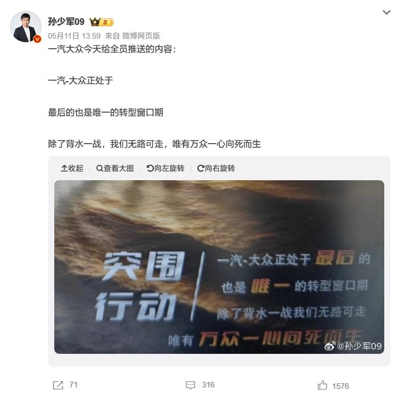 面對(duì)這種現(xiàn)狀,有消息稱近日一汽大眾發(fā)布了“突圍行動(dòng)”的內(nèi)部通知,主要內(nèi)容是一汽大眾正處于最后的也是唯一的轉(zhuǎn)型窗口期,除了背水一戰(zhàn)無路可走,唯有萬眾一心向死而生。