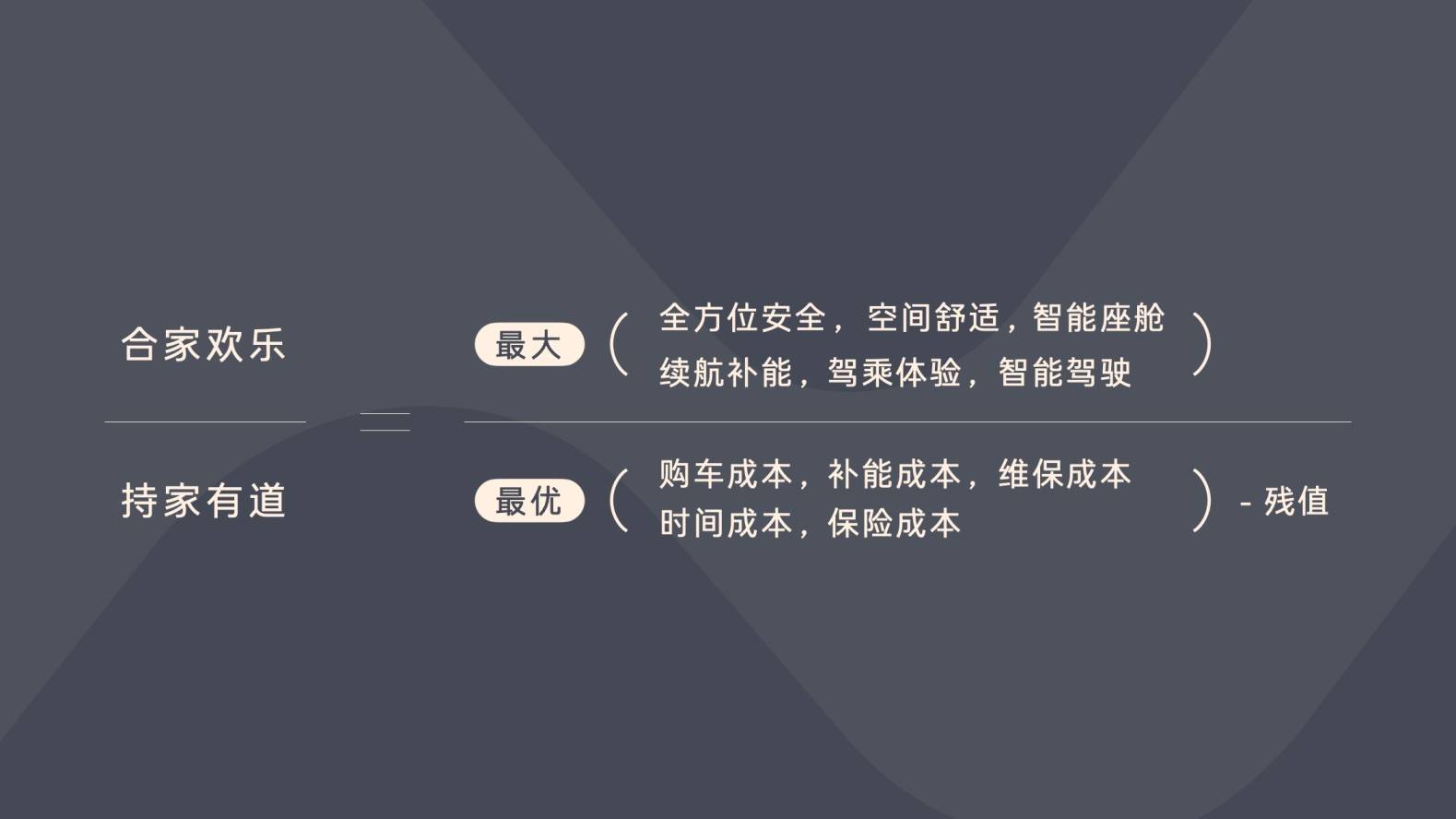 通過對(duì)家庭用車真實(shí)需求的深刻洞察,樂道確立了定義與開發(fā)產(chǎn)品的理念——“合家歡樂,持家有道”,并以此為基礎(chǔ)提出了家庭用車全新標(biāo)準(zhǔn)——家庭用車價(jià)值公式。通過體驗(yàn)價(jià)值的最大化,和擁車成本的最優(yōu)化,樂道推出首款車型 L60,重新定義了家庭用車的新標(biāo)準(zhǔn)。
