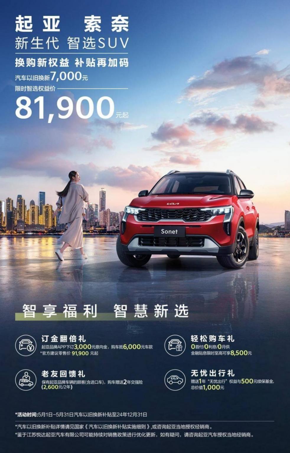 本次新車共推出舒適版、豪華智享版2款車型。與此同時,起亞還帶來了訂金翻倍禮、輕松購車禮、無憂出行禮、老友回饋禮,多重購車大禮包,限時智選權益價81,900元起。全新車型索奈定位“新生代智選SUV”。為感恩用戶對起亞品牌的支持與信賴,全新車型索奈還為用戶提供了從買車到用車一條龍服務: