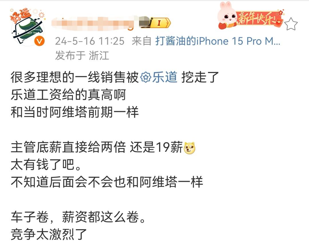 據一位理想KOC透露,目前很多理想的一線銷售被樂道挖走了,樂道開出很誘人的工資,銷售主管底薪兩倍,19薪。