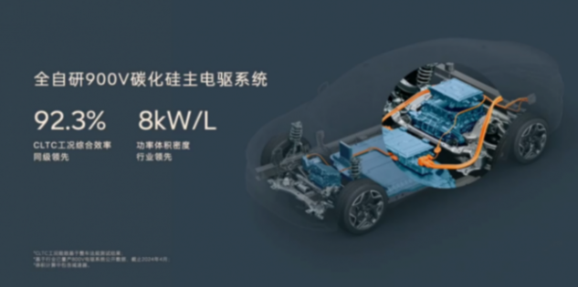 在提升效率方面,樂道L60采用了旗艦車型蔚來 ET9 上首發的全域 900V 高壓架構。這一架構下,電驅系統綜合效率 92.3%,續航里程最低為 555 km,最長續航能做到 1000km 以上。
