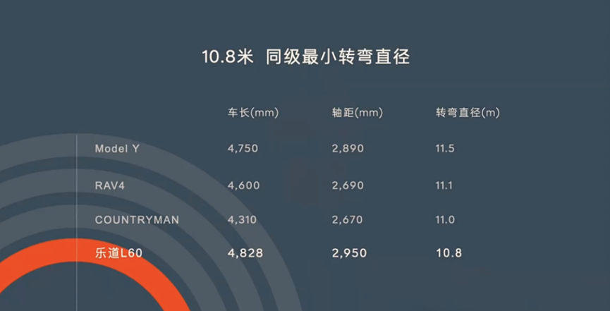 行云底盤還為樂道L60帶來了10.8米同級最小的轉彎直徑,比MINI Countryman、特斯拉Model Y、豐田RAV4轉彎直徑更小。