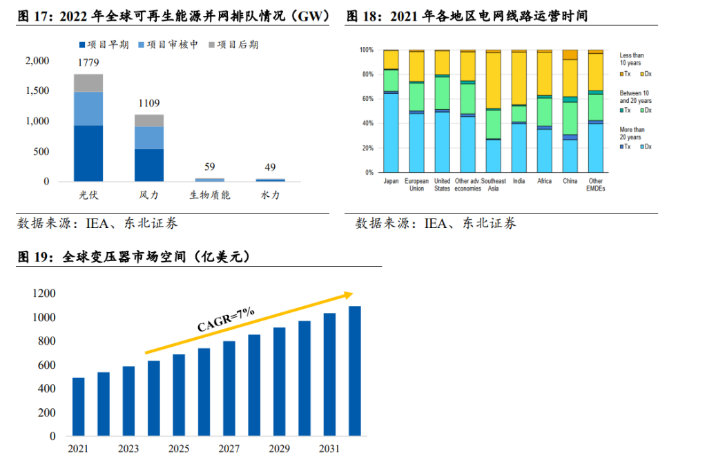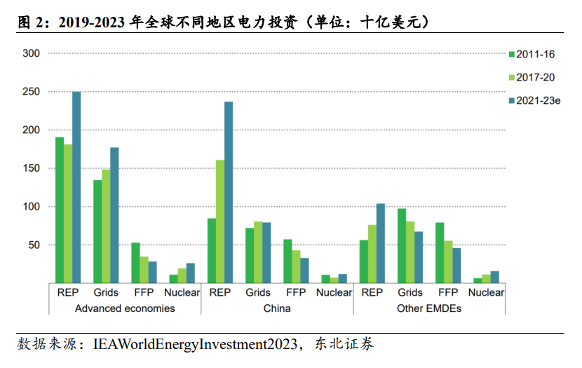 新能源對于電網有著更強的建設需求拉動作用。伴隨著全球能源轉型進程,新能源發電占總發電量比例持續增加,根據IEA估計,在接下來的三年里,可再生能源和核能將主導全球電力供應的增長,平均而言兩者將滿足超過90%的新增需求。
