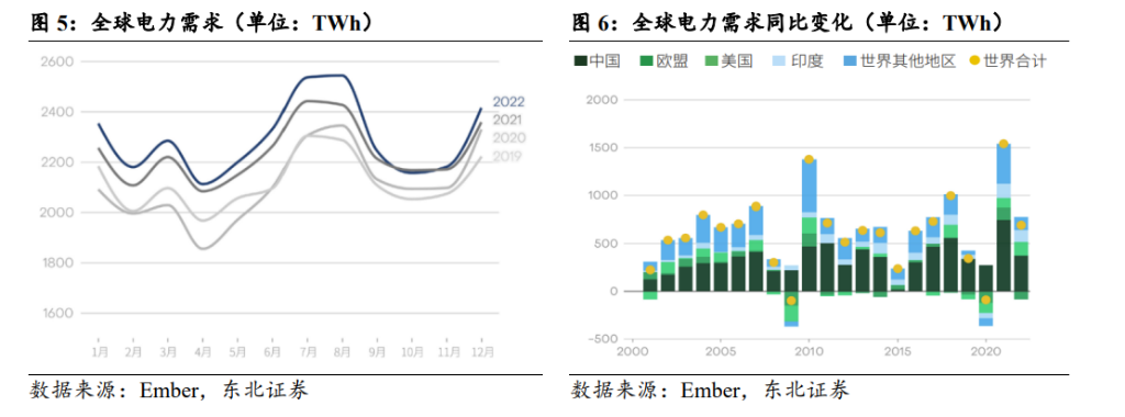 用電側經濟發展推動用電需求持續增長。自2000年以來全球用電需求幾乎翻番,根據國際能源署估計,2022年達到28510TWh,預計到2050年將繼續增長,較2022年增長可能超過75%至120%。