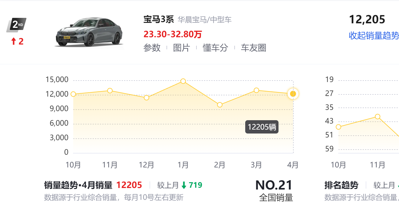從最新的四月份銷量榜單來看,寶馬3系這款車在30天的時間里足足賣出12205輛,這個市場表現對于現在的中級燃油豪華車來說,已經是不錯的了,要知道同級的奧迪A4L和奔馳C級銷量也不是很景氣,尤其是奧迪A4L才賣出了8497輛,可以說現在的燃油中級車,壓力都是很大的,降價能夠獲得銷量的車型,已經是不錯的。