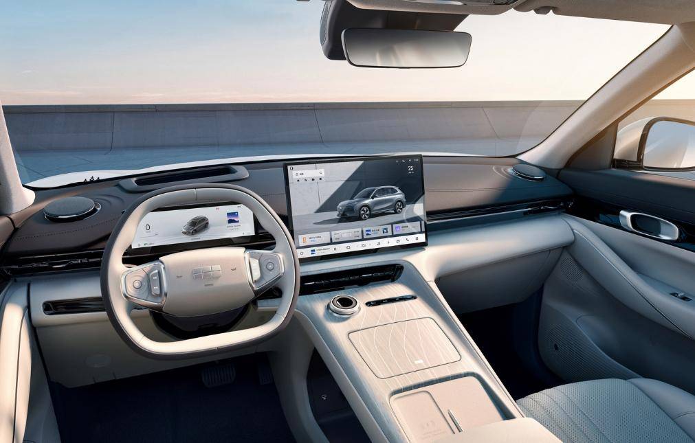 內飾方面,銀河E5的設計較為簡潔,雙色內飾搭配,軟性材質較多,手感不錯。該車空調出風口采用不對稱設計。懷擋設計還省出一部分空間,也是當下比較流行的設計。中控屏幕為為懸浮型,采用Fly Auto系統,搭載龍鷹一號芯片。