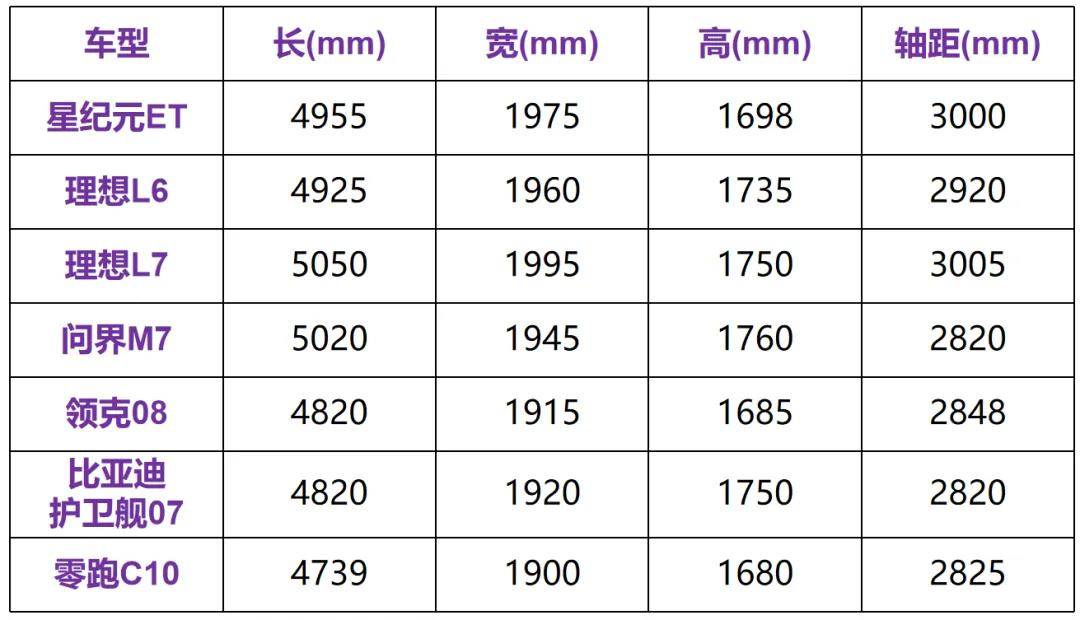 對比尺寸,星紀(jì)元ET的尺寸介于理想L6和L7之間,除了3米的軸距比較突出外,車長和寬度都和L6更接近。而和問界M7相比,星紀(jì)元ET更短、更低,但寬度和軸距有優(yōu)勢。所以從級別來講,星紀(jì)元ET和理想L6、5座版問界M7都算得上同級競品。