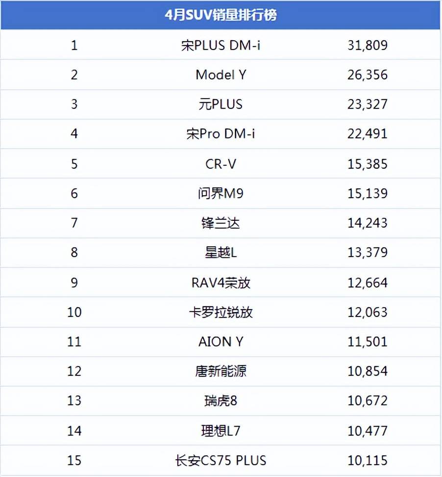 4月SUV銷量排行:新能源車型霸榜,問界M9首次進前十