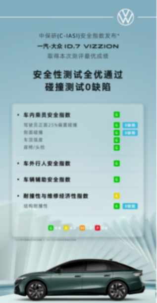 安全,是一切豪華的前提。中國(guó)保險(xiǎn)汽車(chē)安全指數(shù)(簡(jiǎn)稱(chēng):C-IASI)測(cè)試能為我們普通購(gòu)車(chē)者提供一定的參考依據(jù)。在5月11日發(fā)布的最新一批C-IASI測(cè)試結(jié)果中,一汽-大眾旗下純電旗艦轎車(chē)ID.7 VIZZION成績(jī)耀眼,在車(chē)內(nèi)乘員、車(chē)外行人及車(chē)輛輔助三大安全性測(cè)試指數(shù)方面獲得最高等級(jí)(G)優(yōu)秀評(píng)價(jià),在耐撞與維修經(jīng)濟(jì)性指數(shù)方面,ID.7 VIZZION也是本次測(cè)試中唯一一款獲得(A)良好評(píng)價(jià)的車(chē)型。