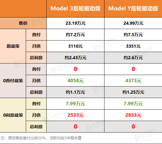 按首付比例30%,貸款5年來算:Model 3后輪驅動版23.19萬元,首付約7.2萬元,月供3110元,總利息約2.43萬。若選0首付,月供需要4058元,總利息也只要1.1萬多;若選0利息,首付則需7.99萬元,前期壓力比較大,月供只需要2533元,但卻能省掉大幾萬的利息。Model Y后輪驅動版24.99萬元,首付約7.5萬多,月供3351元,總利息約2.6萬元。若選0首付,月供需要4373元,總利息約1.25萬元;若選0利息,首付也需要7.99萬元,月供只需要2833元,可省大幾萬的利息。