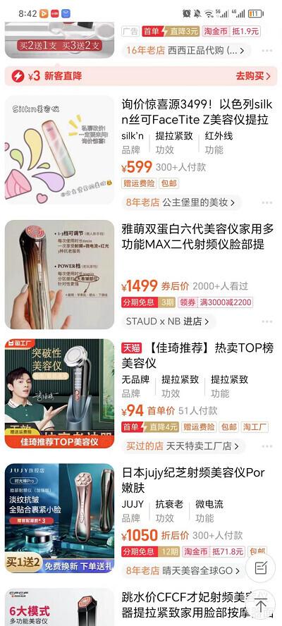 記者查詢發現,花至、雅萌、覓光等品牌的京東旗艦店、天貓官方旗艦店均已下架射頻美容儀產品,但相關平臺的一些店鋪仍舊在出售“射頻美容儀”。