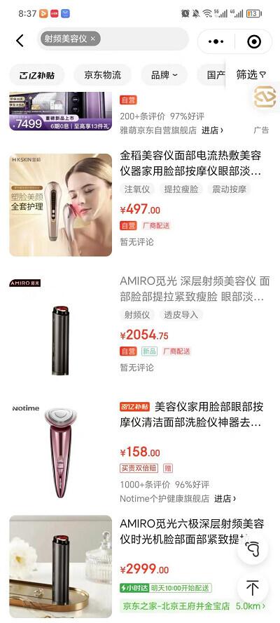 在京東平臺,京東自營的“覓光深層次射頻美容儀”、京東之家北京王府井金寶店的“覓光六極深層射頻美容儀”、京東之家龍旗廣場店的“六極射頻美容儀”和“濟循大藥房旗艦店”的“花至F100 Pro升級款射頻家用美容儀”等顯示都可以購買。