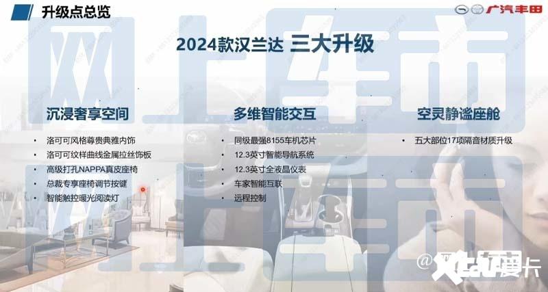 網(wǎng)上車市從廣汽豐田官方了解到,2024款漢蘭達(dá)將于5月31日上市。新車針對配置進(jìn)行調(diào)整,包含空間、智能化和靜謐性3大升級。車內(nèi)搭載12.3英寸全液晶儀表+12.3英寸智能導(dǎo)航系統(tǒng)(現(xiàn)款7英寸+12.3英寸),升級8155車機(jī)芯片、車家智能互聯(lián)、遠(yuǎn)程控制。