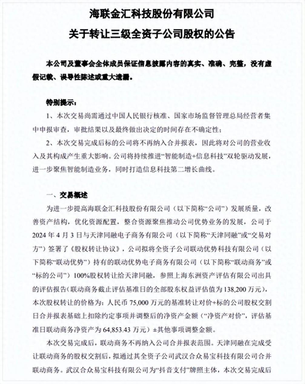 4月3日晚間,A股上市公司海聯金匯發布《關于轉讓三級全資子公司股權的公告》。公告顯示,海聯金匯已與天津同融電子商務有限公司(以下簡稱“天津同融”)簽署了《股權轉讓協議》,擬將全資三級子公司聯動優勢電子商務有限公司(以下簡稱“聯動優勢”)100%股權轉讓給天津同融,其全部股東權益評估值為13.82億元。
