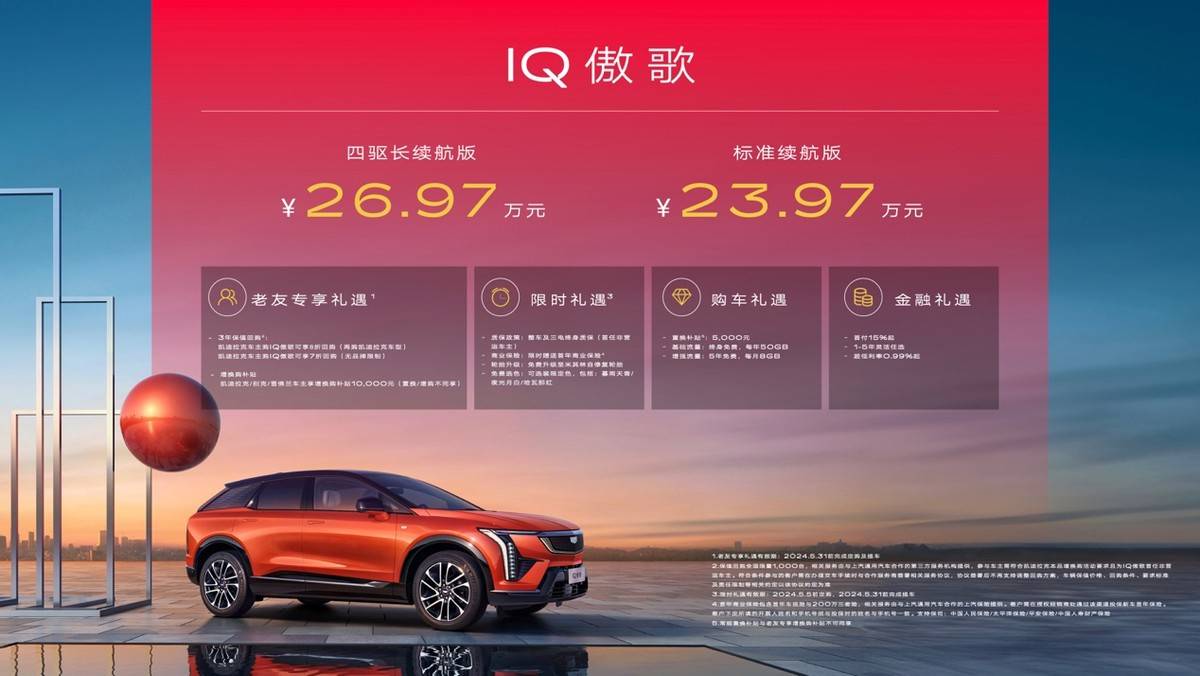 在前不久剛結束的2024北京國際車展上,凱迪拉克IQ傲歌正式上市,新車兩款配置的指導價分別是23.97萬元和26.97萬元。沒錯,沒有那么多花里胡哨的配置車型,一共就兩款,分別是兩驅標準續航版和四驅長續航版。這臺車和之前的IQ銳歌一樣,誕生于奧特能平臺,定位純電中型SUV。
