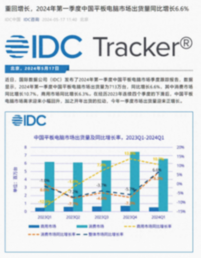 5月17日知名數據調研公司IDC就正式發布了,2024年第一季度國內平板電腦市場調查報告。報告顯示在過去的第一季度國內平板電腦整體出貨量為713萬臺,同比增長6.6%。而且IDC把平板電腦市場分析消費市場與商用市場,前者同比增長10.7%,后者同比增長6.3%。這是國內平板電腦市場連續四個季度同比下滑之后,首次迎來正增長。