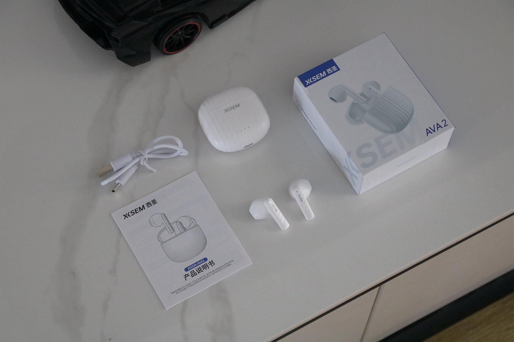 打開盒子取出里面所有物品,來看看西圣AVA2都有些什么物品,可以看到它分別有耳機、充電盒、充電線、說明書這些物品,當然這也是市面上的藍牙耳機標配。