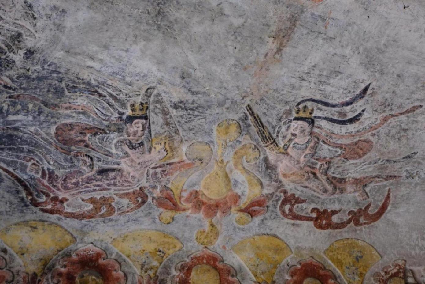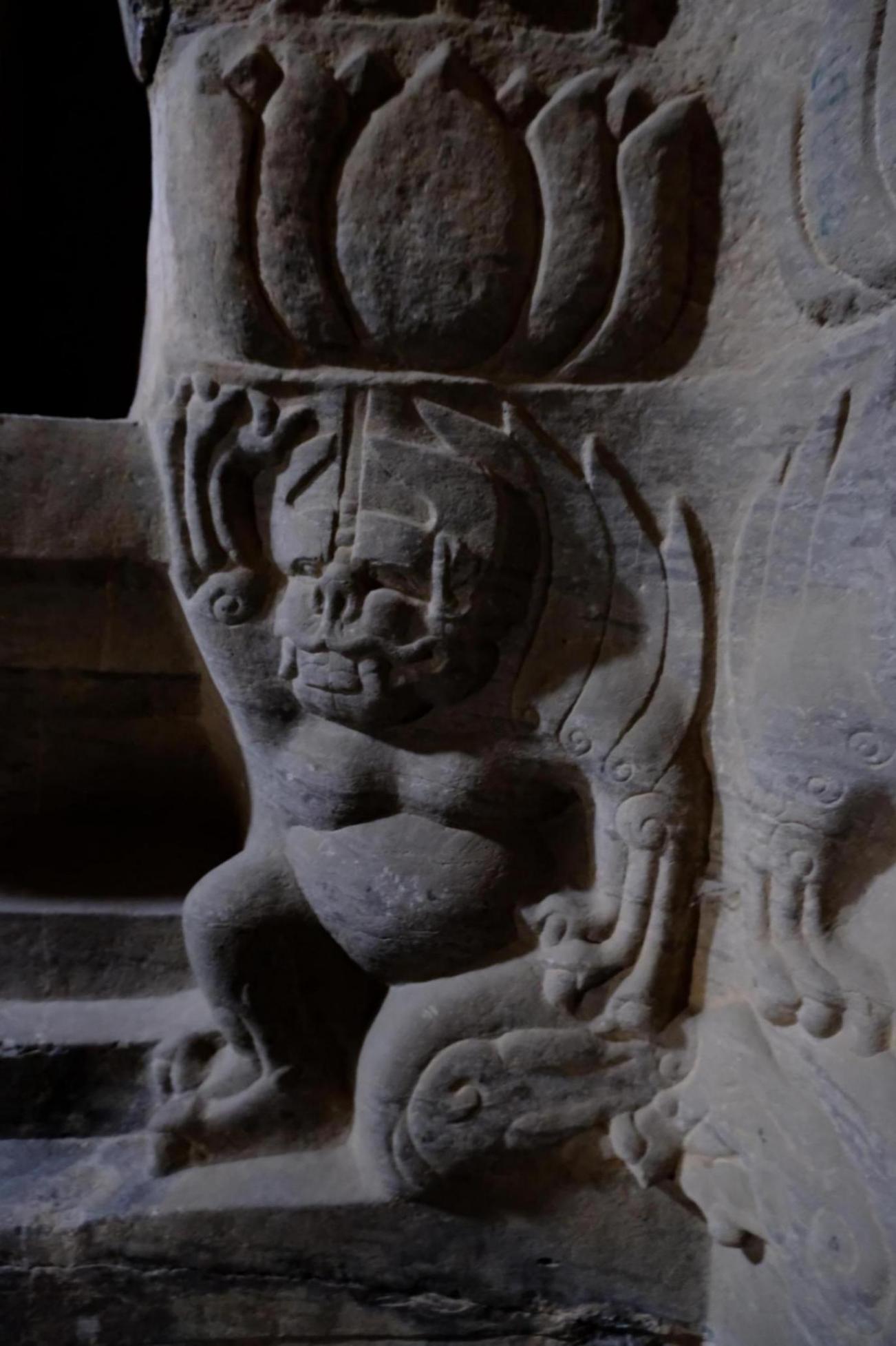 第二精彩的大概是南響堂千佛洞穹頂的八身飛天,乃南響堂鎮窟之寶。其中兩身凌空飛舞,兩身天女散花,另外四身分別演奏笛、阮、笙、箜,以舞姿、音樂、鮮花供養諸佛,褒衣博帶盡顯神采飄逸之姿。飛天以香為食,不近酒肉,穹頂亦有從前的煙熏之跡。凡人仰觀良久,恍恍惚惚,神游于天人之際。南北響堂其余各窟的造像、佛龕、檐柱、浮雕、壁畫、神獸等,多有精妙幽微之處,須親臨感受。