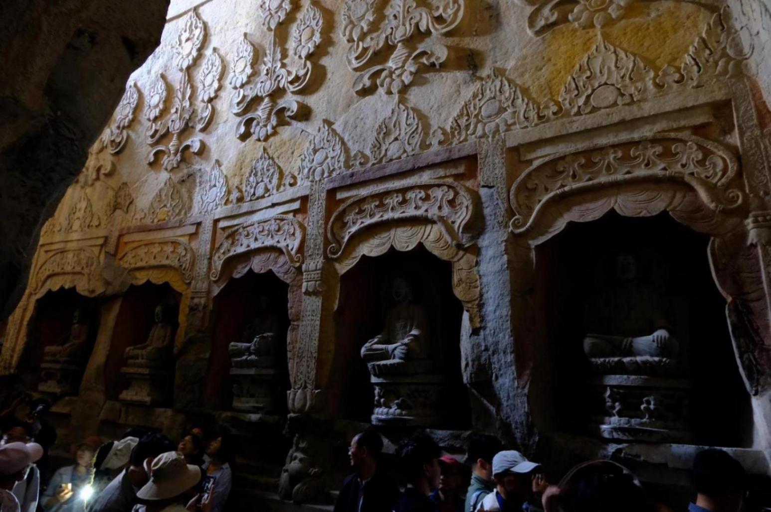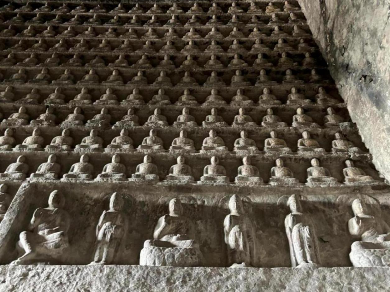 響堂山石窟最驚艷絕倫的作品莫過于北響堂的大佛洞。隨五一旅游的人潮排隊良久,在進入洞窟的一剎那,感覺如同《華嚴經》所言 “譬如一燈,入于暗室,百千年暗,悉能破盡”,撲面而來的火焰背光與莊嚴寶相讓人不由得呼吸一窒。佛祖結跏趺坐于高處,既看北朝人,也看著你,當你與那低垂的眉目相對,一千五百年的時光洶涌而過,敷金彩繪剝落,紋飾壁畫漫漶,木構廊廡朽爛,露出佛像寂然歡喜的本來面目。戰爭、法難、盜鑿,歷史的騷響漸不可聞,爾曹身與名俱滅的千年,不過是佛祖拈花一笑的瞬間。