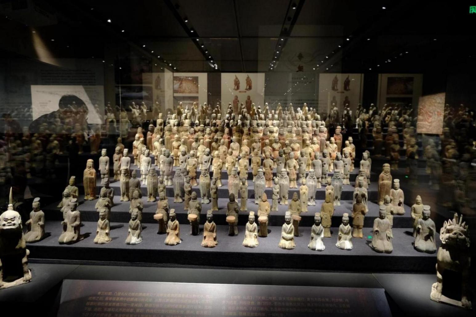 相較于坐落在普通街道一側、建筑面積5000多平方米的鄴城考古博物館,北朝考古博物館的規劃則大氣得多,它的建筑面積約為12000平方米,館前還有一大廣場。該館陳列以“走向隋唐”為主題,分為煌煌帝都、巍巍陵寢、泱泱文明3個展廳和一個特別展廳,主要展示北朝墓群出土遺物,其中又以陶俑的數量為最。值得一提的是,特別展廳按一比一的比例復原了灣漳北朝大型壁畫墓,蔚為壯觀。