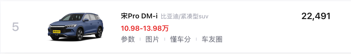 比亞迪元PLUS(第04名/11.98-16.38萬元)、比亞迪宋Pro DM-i(第05名/10.98-15.98萬元)、比亞迪宋PLUS DM-i(第07名/12.98-18.98萬元)三款比亞迪SUV共同分享了三個名次,三者的名次剛好與定位相悖,排序從高到低,三款車都在過去兩年完成了重要改款,并在今年加入到了榮耀版陣容當中,最大門檻降幅達到了3萬元,其中,完成了e平臺3.0 SUV首秀的元PLUS更是覆蓋了八合一電驅、CTB車身電池一體化、寬溫域高效熱泵等一系列領先技術,在綜合效能上達成了低價高能。