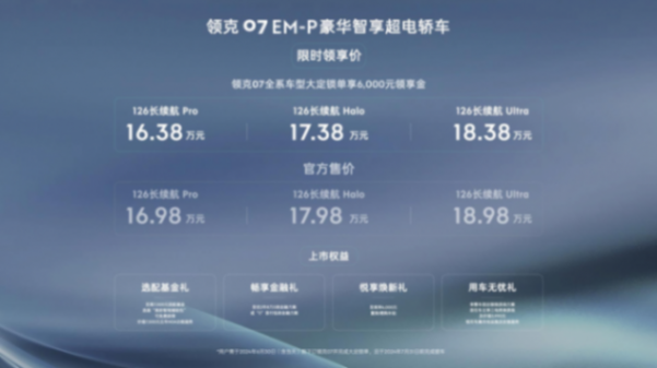 5月17日,領克首款新能源B級轎車——領克07 EM-P正式上市,新車售價在16.98-18.98萬元之間。