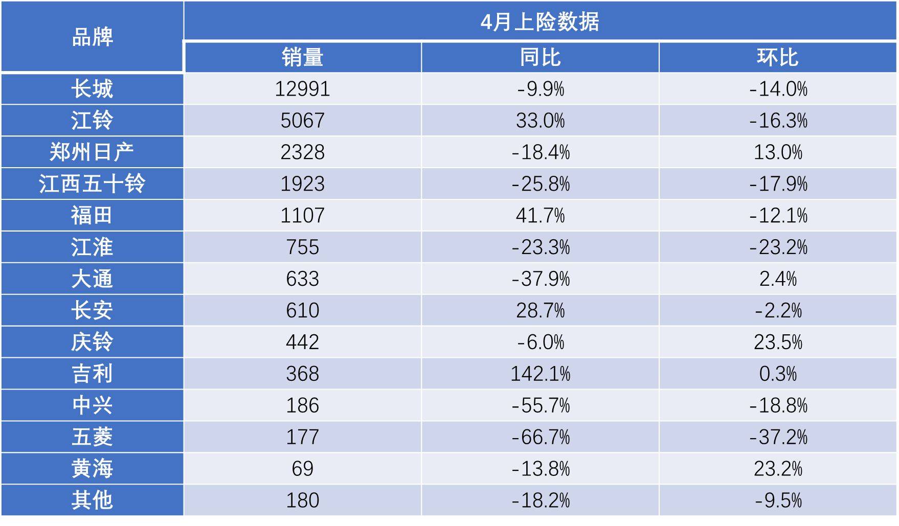 在行業整體疲軟時,一家企業要做到逆勢增長,并不容易。面對市場增長動力不足時,頭部企業也很難保持銷量增長,并可能出現較大幅度下降。據終端上險數據顯示,4月,常年位列皮卡行業第一的長城,銷量出現同比下滑;鄭州日產常年在皮卡行業排名第三,同比數據也出現下降。