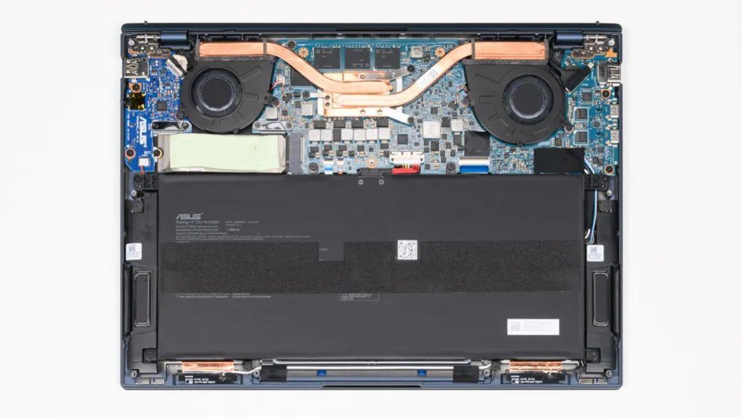 上圖是華碩 靈耀13 2024的拆機(jī)實(shí)拍圖,雙風(fēng)扇雙熱管的組合。