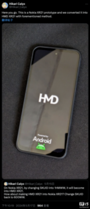 日前博主 Hikari Calyx 在 X 平臺發(fā)文,發(fā)現(xiàn) HMD XR21 與諾基亞 XR21 手機在規(guī)格方面完全一致,僅僅只是軟件層面的標識符存在區(qū)別,用戶只需要將自己的諾基亞 XR21 手機的 SKUID 修改為 1HMWW,即可將自己的諾基亞 XR21 手機在軟件層面“變成”HMD XR21 手機。