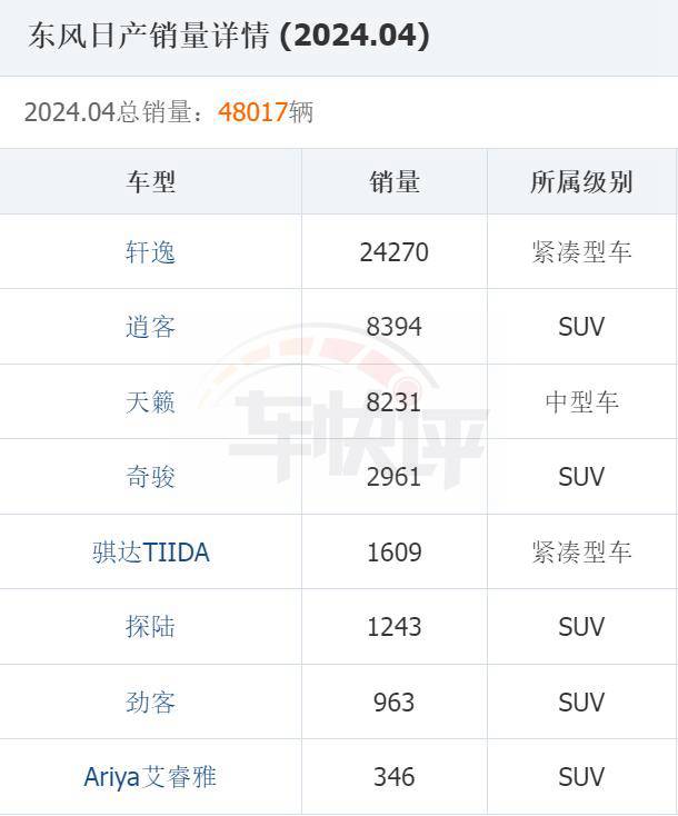 看了一下東風日產4月的銷量數據,累計銷量為48017輛。環比下降9.5%,同比下降6%。其中軒逸的銷量為24270輛,占東風日產總銷量的50%以上。
