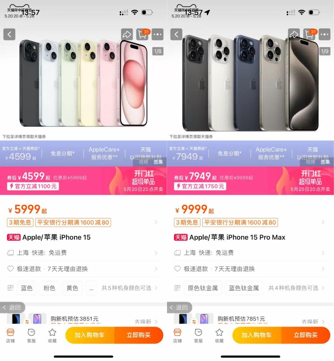 從天貓頁面來看,iPhone15 全系降幅千元,MAX 版本甚至降了 2000 多。