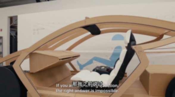 首先它沒有方向盤,站上去中控臺的中間只有一塊屏幕,而且它的座椅很特別,是聯排座。當然如果把這段視頻繼續放下去,它又出現了一個模型。
