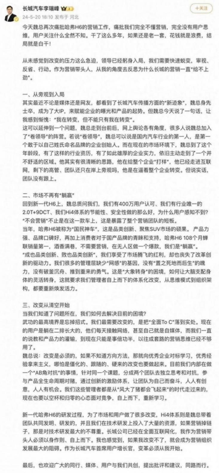日前,長城汽車CGO李瑞峰在社交媒體上透露,魏建軍對哈弗H6的營銷工作感到不滿,并稱其完全不懂營銷,完全沒有用戶思維,用戶關注什么全然不知。干了這么多年,如果還是老一套,花錢就是浪費,結局就是白干!