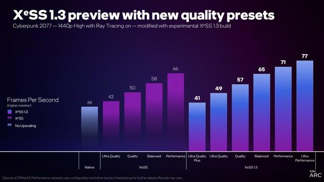 英特爾官方也放出了新選項下的畫面幀數差異,以《賽博朋克2077》為例,更多的XeSS畫質選項使得幀數提升更加平滑,為玩家帶來更多選擇。