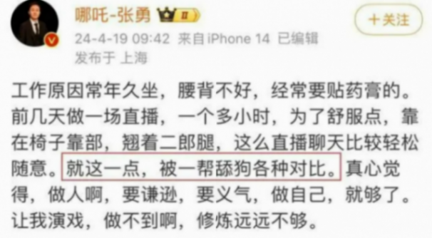 張勇發(fā)微博回應(yīng),“工作原因常年久坐,腰背不好,為舒服點靠著椅子蹺二郎腿,這樣直播比較輕松隨意,“就這一點,被一幫舔狗各種對比。”