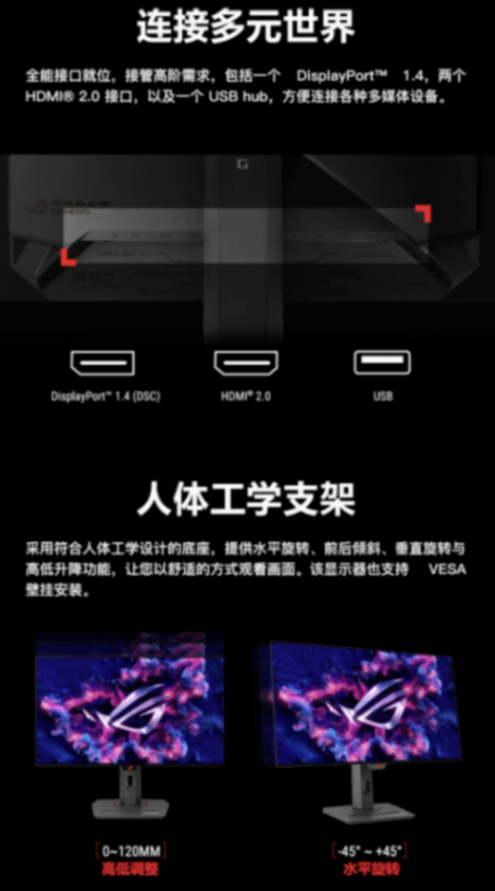 IT之家注意到,該顯示器隸屬于華碩 ROG Strix 系列,采用今年 ROG 顯示器家族式的底座(自帶手機支架功能);顯示器支架支持旋轉 / 傾斜 / 升降 / 橫豎;提供 1 個 DP1.4 接口、2 個 HDMI 2.0 接口及 USB-HUB 功能(提供 USB-A 接口,具體數量未知)。