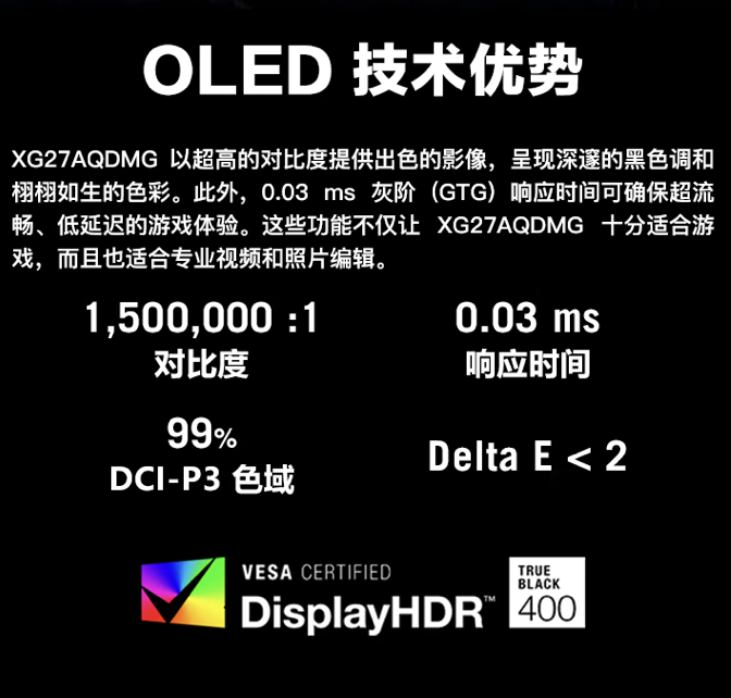據介紹,這款顯示器采用 26.5 英寸 2560x1440 分辨率 240Hz OLED 面板,擁有 0.03ms 響應時間、10bit 色深,通過 HDR 400 認證,覆蓋 99% sRGB 色域;據稱相比上一代 PG27AQDM 產品,SDR 亮度提升 100%、APL 亮度提升 20%(前代 25% APL 亮度為 450 尼特)。